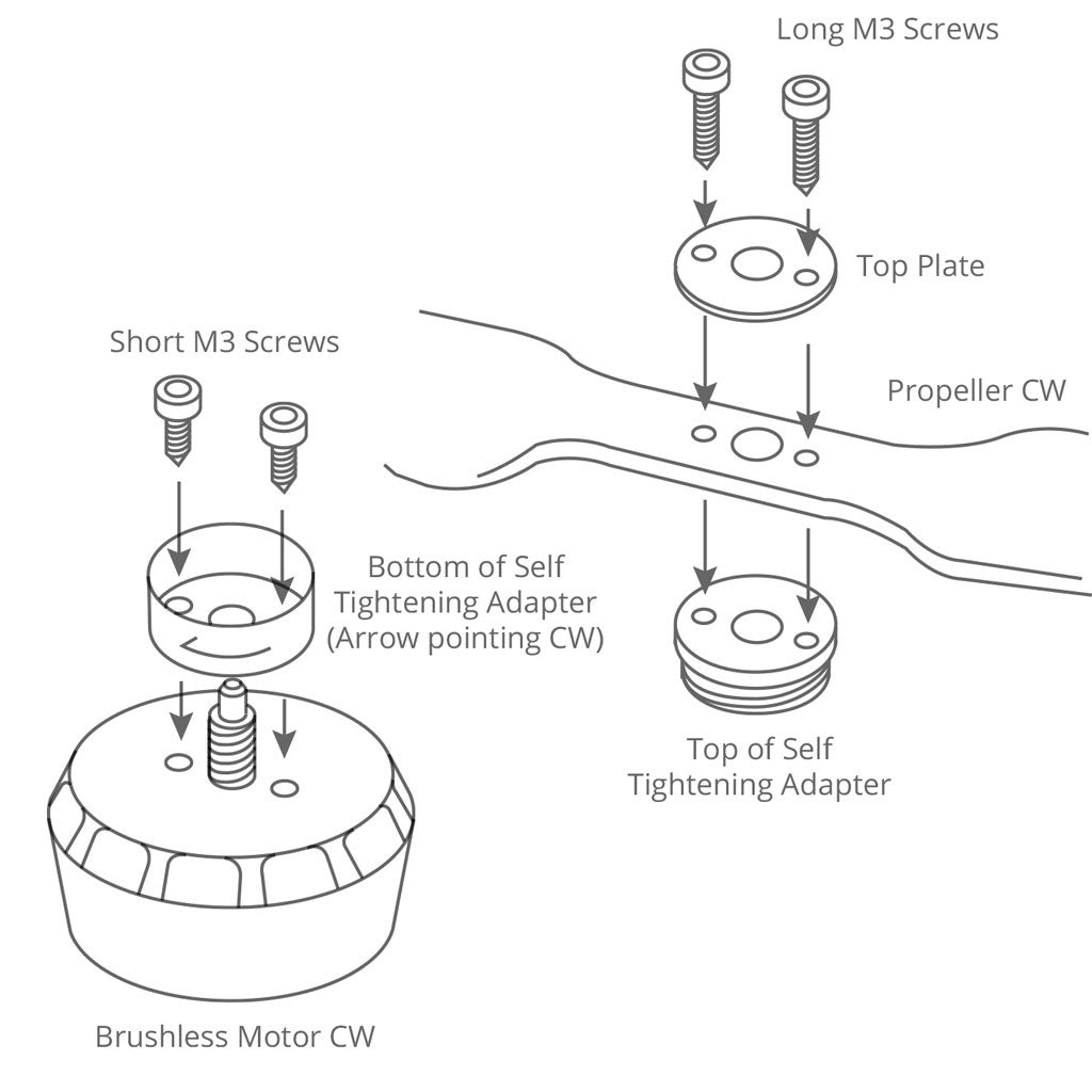 - Longer screws are used to mount the propellers to the top part of the self tightening adapters.