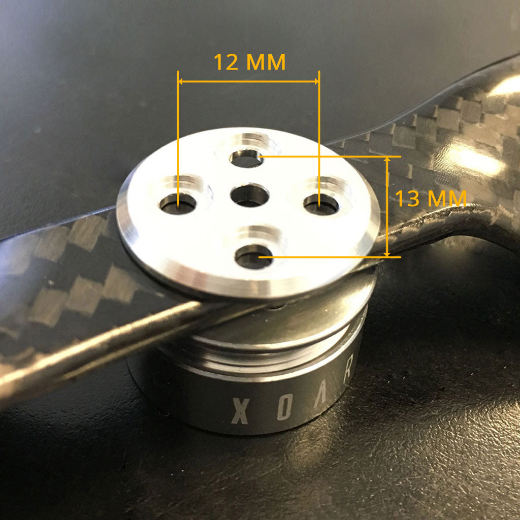 Xoar Self-Tightening adapters are made with high quality aluminum. New patent pending locking mechanism will securely lock the propeller and adapter in place for flights. You can conveniently mount or discount the propellers in seconds. The adapters come with 2 sets of mounting holes with circular diameter of 12mm and 13mm in order to support both DJI and other motors mounting pattern, such as T-motor, KDE motors. It is recommended to apply threadlocker on the adapters to hold the props in more securely. Please note, it is optional to install the props using the adapters. The propellers can be mounted directly on the motors.